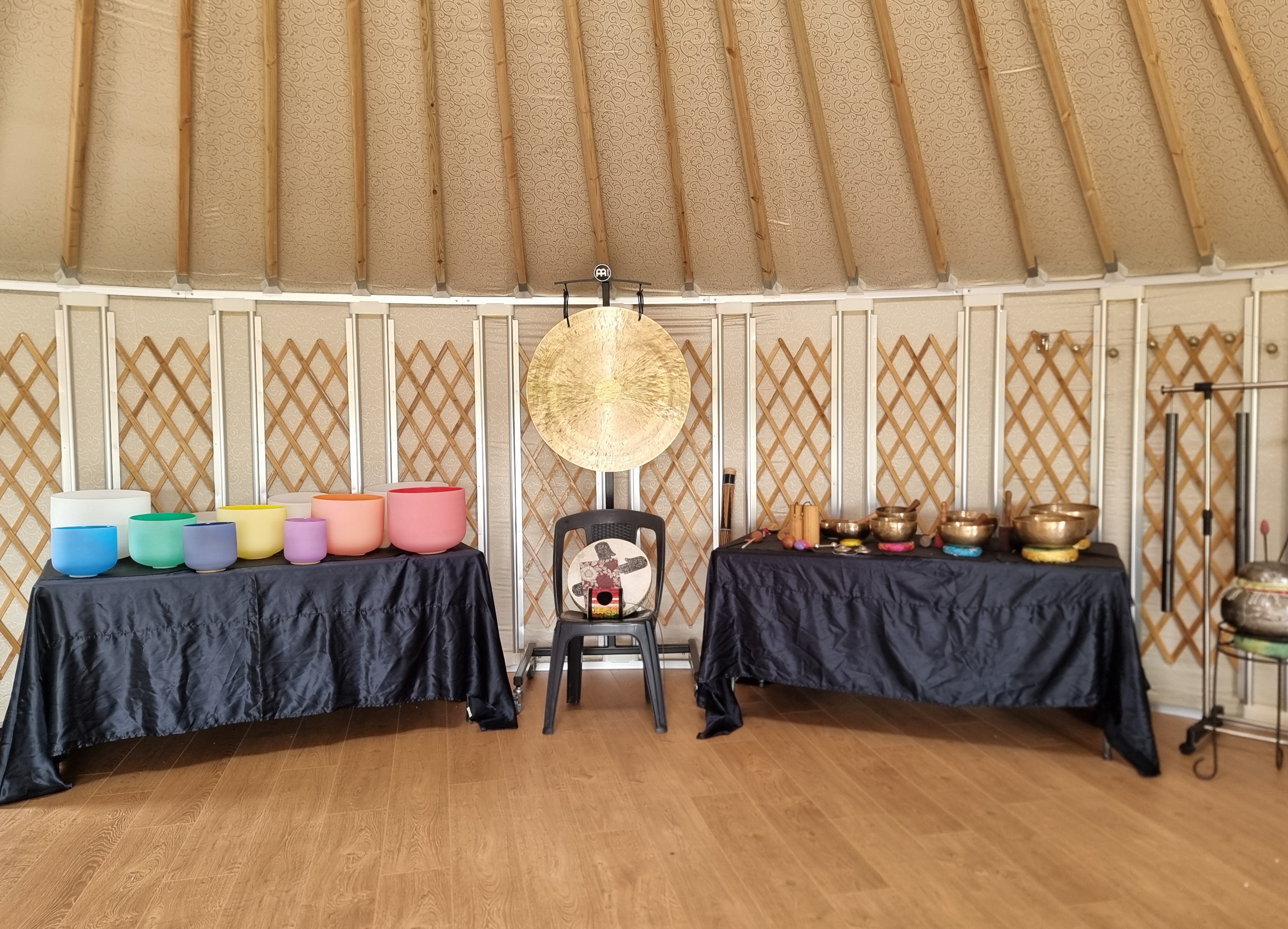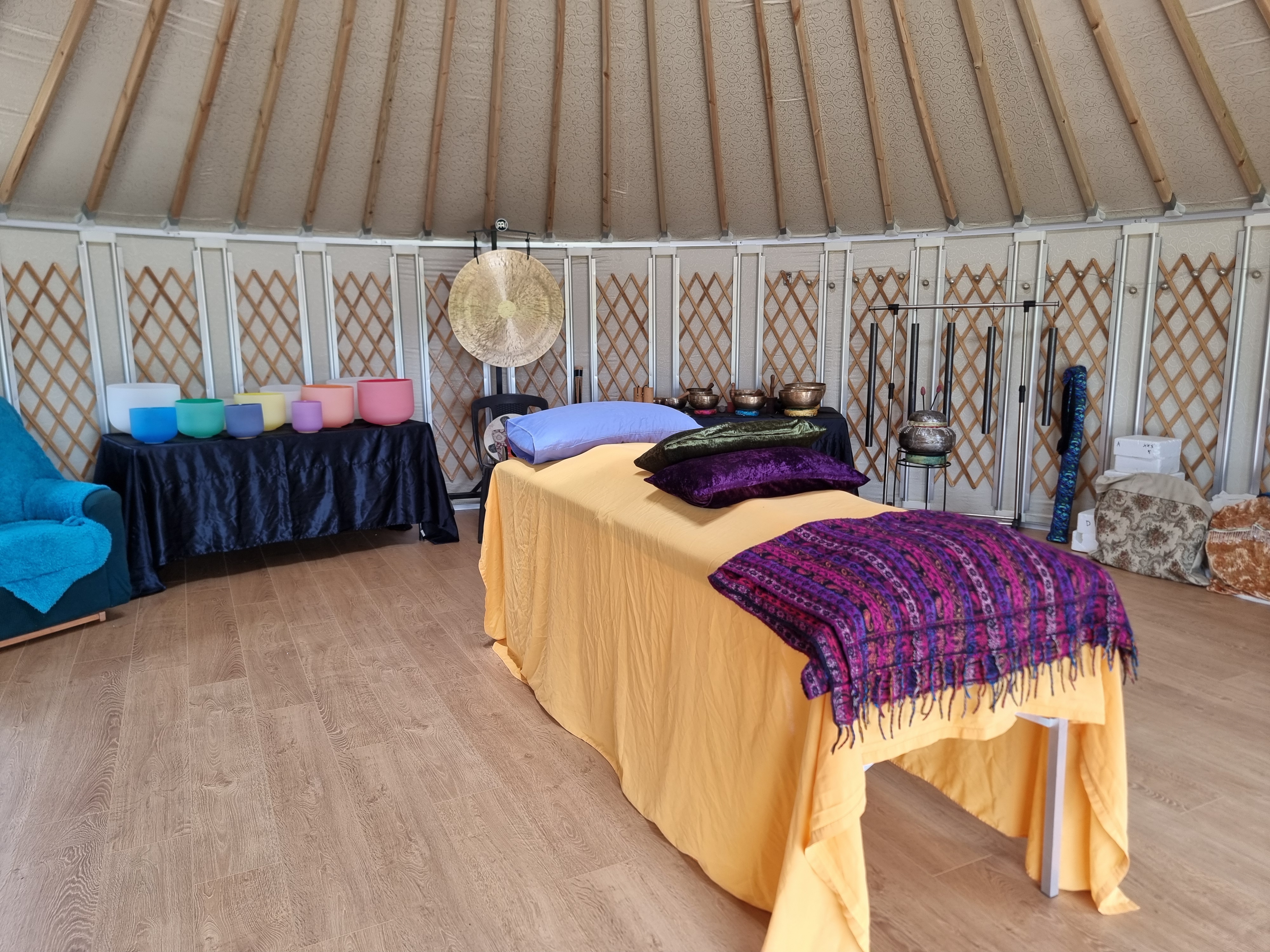 I have finally created a new space for Group, Individuals, workshops, drumming groups and other wellness practitioners to use. It has taken 15 years to see my dream come true. The seed was planted in 2011 when I finish my Diploma studies. I have been working out of a wee cottage and taking my instruments to halls for groups, which has been okay but always stressful. But now my wonderful sound instruments and I have a home. Welcome to EarthSounds. You can find me on FB as well. That is where I will post upcoming sessions and Events. The yurt still has a bit of outside work to be done eg. a fence to shelter it from the prevailing westerly wind, a sheltered area just outside the door for shoes and a bathroom for comfort.